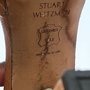 Elevate your style with these elegant tan peep-toe shoes from Stuart Weitzman. Perfect for any occasion, these shoes offer both comfort and sophistication.