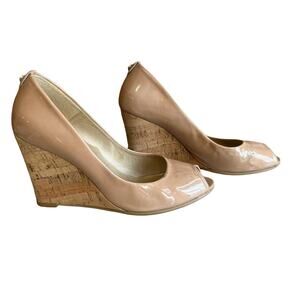 Stuart Weitzman Anna Open toe nude cork wedges, size 7. Good preowned condition with a few dark marks on the right shoe - see photos