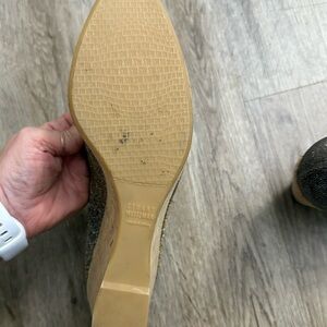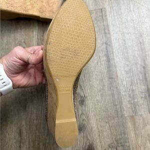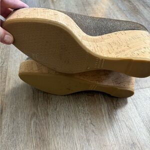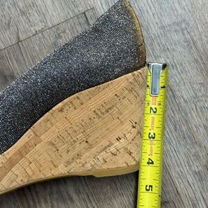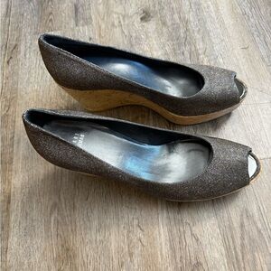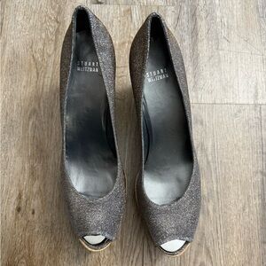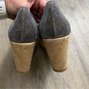 Stuart Weitzman glitter platform cork wedge shoes. Slip in, peep toe. Beautiful wedges with an all over Metallic platinum glitter canvas Leather soles. Stuart Weitzman platform wedges with round-toes, tonal stitching throughout and cork heels. Retails for 450.00.