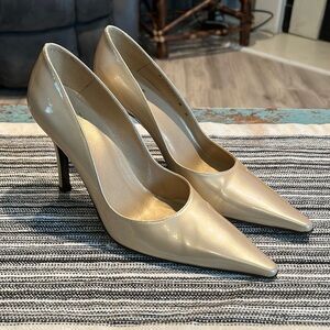 Elegant beige patent leather heels. Sleek pointed toe. Perfect for any occasion.
