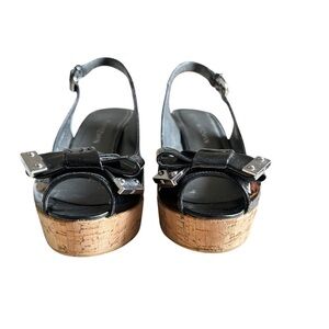 Stuart Weitzman Black Bodajean Bow Patent Leather Wedge Sandals Size 8.5