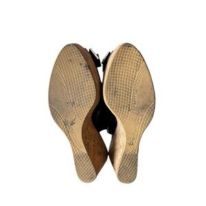 Stuart Weitzman black patent leather slingback wedge sandlas with bow accent on toe strap. Adjustable back straps.
