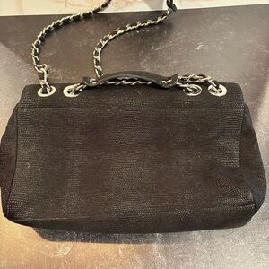 This elegant black bag features a stylish chain strap, perfect for any occasion. Textured leather and snap closure. 1 interior zip pocket and 2 slip pockets, animal print interior. In excellent condition, see photos for condition and measurements. Strap can be worn longer as shown or you can double up for a short shoulder bag.