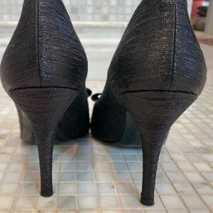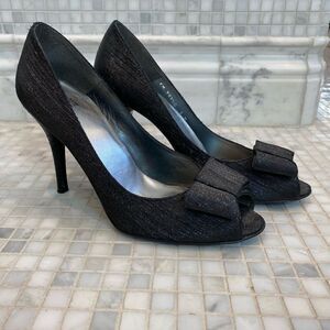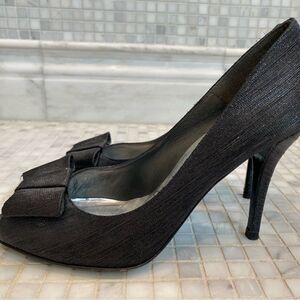 Stuart Weitzman Black Fabric Heels with Bow and Peep Toe. 4 inch heels. Good used condition. There is very minor wear as pictured.