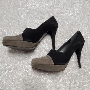 Stuart Weitzman two-toned suede platform heel. Gray toe and platform with black heel and upper part of shoe with gray vertical strip on heel. Lovely stitching detail. Semi-pointed toe. Made in Spain. Size 8.5 M. Platform 1" heel 4.5". Excellent condition.