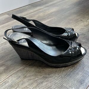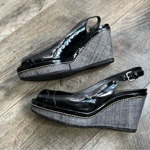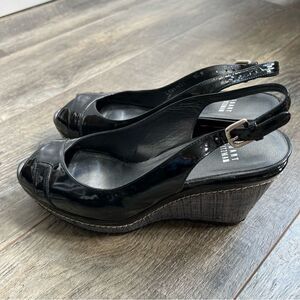 Stuart Weitzman Black Grey Patent Leather Wedge Slingback Peep Toe Heel Sz 8.5