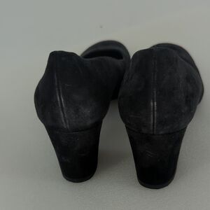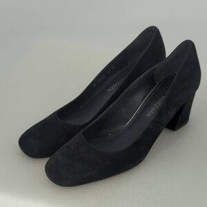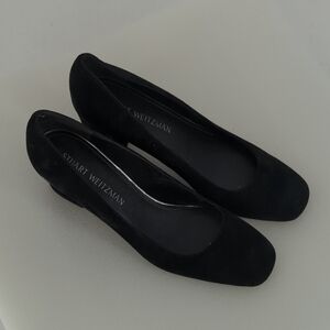 These Stuart Weitzman black heels feature a refined suede-like finish and a minimalist slip-on design. With a square toe box and a modest heel, they offer both comfort and style for versatile wear. Their understated elegance makes them a perfect choice for professional and casual occasions alike.