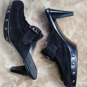 Stuart Weitzman Black Leater Buckle Slide Sport Suede Mules