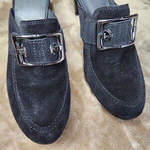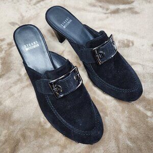 Stuart Weitzman Black Leater Buckle Slide Sport Suede Mules