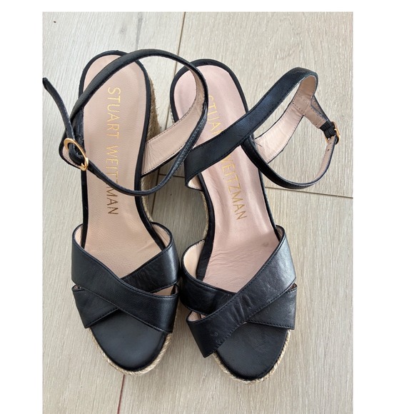 Keywords: Stuart Weitzman, espadrille, wedge sandals, black leather, ankle strap, summer shoes, resort wear, designer sandals, platform sandals, fashion footwear, vacation shoes, evening sandals, day to night