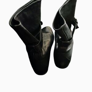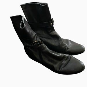 Stylish black leather ankle boots with a sleek design. Features a strap detail for added flair.