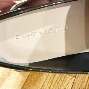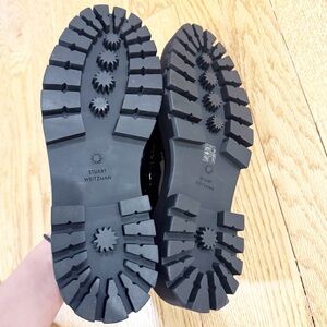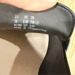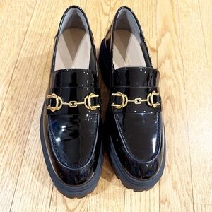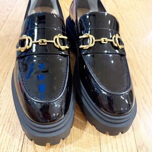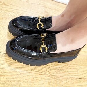 Sleek black loafers with a glossy finish. Features a gold buckle detail. Chunky sole for added style.