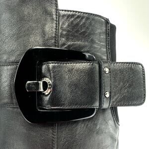 Stuart Weitzman Buckley Black Over The Knee Tall Boot Block Heels Platform Size 5M Leather High-Low Pull-On Style.