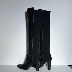 Like new. Worn maybe once. Pointed/almond shaped toe, with a 4 inch thicker heel, part of the 50/50 series of boots. Half shiny black leather, with thick stretch fabric for the perfect fit on the back. Boot hits over the knee. In pristine condition. Fit true to size.