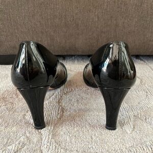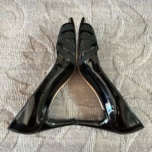 EUC Leather Sole Black Shiny Patent Leather Pump with Fabric Ribbon Detail at Open Toe