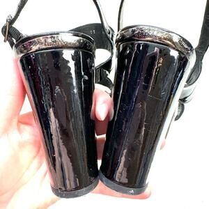 Good used condition! Black patent leather platform block heels. Two thick foot straps with a sling back heel. Some imperfections to back heels, all shown in photos. Heel height of 4 in.