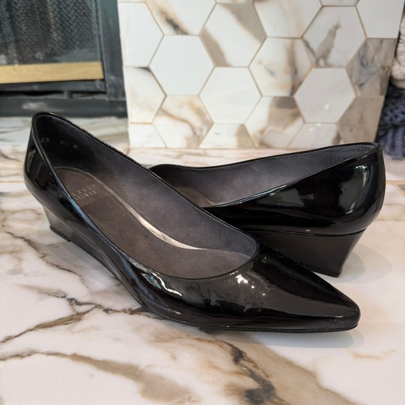 Stuart Weitzman black patent leather wedge pumps offer a sophisticated silhouette with a pointed toe and a comfortable low wedge heel. These classic shoes are crafted with high-quality materials, including a sleek patent finish and a cushioned footbed for all-day wear. The timeless design makes them a versatile choice for office settings, formal events, or elevating a casual ensemble.