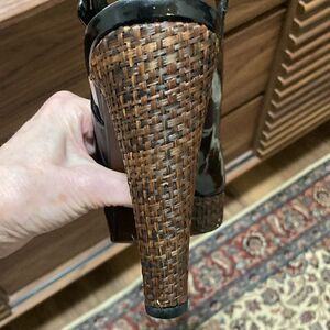 Stuart Weitzman black patent leather sling back peep toe pumps. Features brown braided raffia heel & platform with adjustable buckle closure.