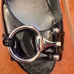 Stuart Weitzman Black Patent Leather Wedge Pumps w/ Silver Buckle – Size 8.5