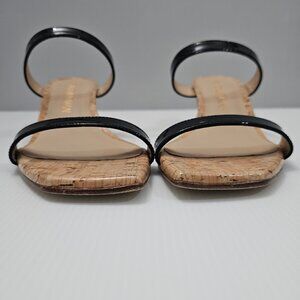 Elegant black patent leather sandals. Features a cork wedge heel. Perfect for any occasion.