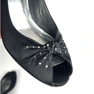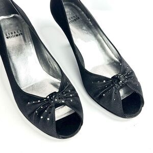 Stuart Weitzman Black Peau De Soie Satin Peep Toe Tonal Rhinestone Accent Pumps