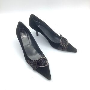 Stuart Weitzman Black Pointed Toe Buckle Suede Heels 7