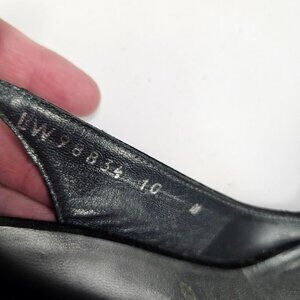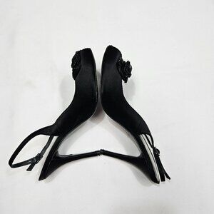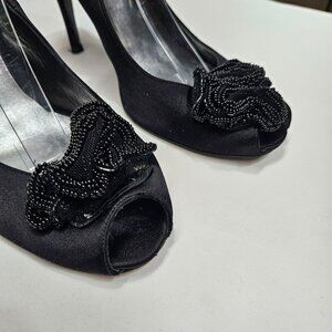 Stuart Weitzman Black Satin Beaded Rosette Peep Toe Slingback Heels Size 10