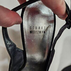 These Stuart Weitzman slingback heels blend elegance and sophistication with their satin finish, intricate beaded design, and peep toe. Perfect for special occasions or a night out, these heels are a testament to timeless style and unparalleled craftsmanship.