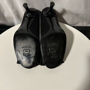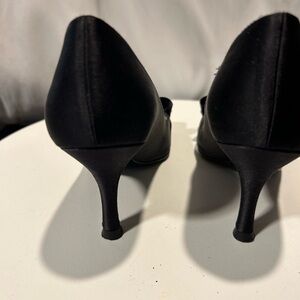 Pleated ribbon bow at front, slim covered heel. Made in Spain, leather soles. Excellent condition, Black Satin, Size: 7 | heel height: 3 inches. Top-rated seller, same-day shipping! Shop my closet for more trendy and vintage items to complement your style!