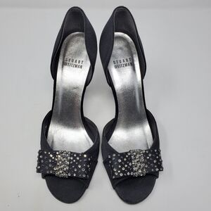 Stuart Weitzman Black Satin Open Toe Leather Heels