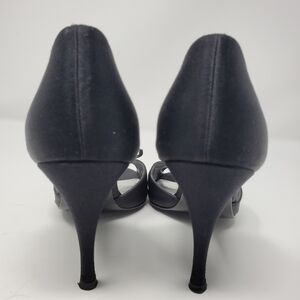 Stuart Weitzman Black Satin Open Toe Leather Heels.