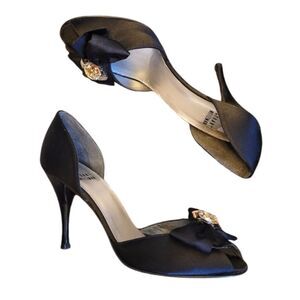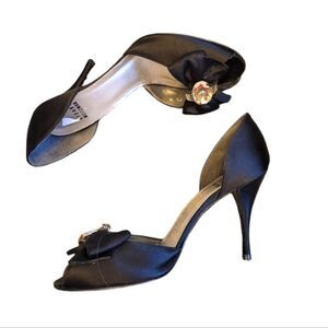 Stuart Weitzman Black Satin Peep Toe Pumps With Rhinestone