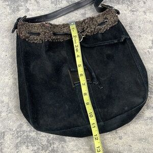 Stuart Weitzman Black Suede Drawstring Hobo Shoulder Bag Shearling Trim