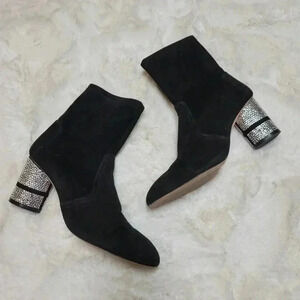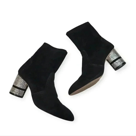 Stuart Weitzman Black Suede Leather Sock Boots Rhinestone Heel Diamond Size 9.5