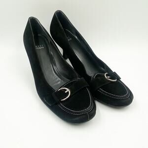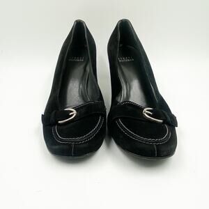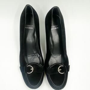 Stuart Weitzman Black Suede Loafer Kitten Heel Round Toe Silver Buckle 7M