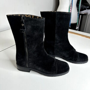 Stuart Weitzman Black Suede Mid-Calf Boots Cheetah Print Interior Round Toes Exposed Zip Closure at Sides