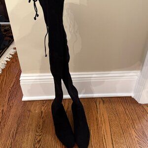 These are authentic Stuart Weitzman OTK boots in black stretch suede — classic, super flattering, and incredibly comfortable. Purchased for $600 and the retail price has gone up since. Worn only a handful of times (soles show minimal wear). Made in Spain.
