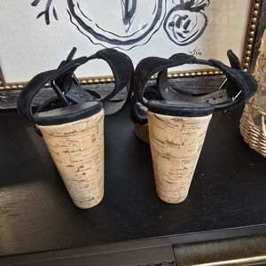 Elegant black wedges with a cork platform. Stylish and comfortable for any outing.