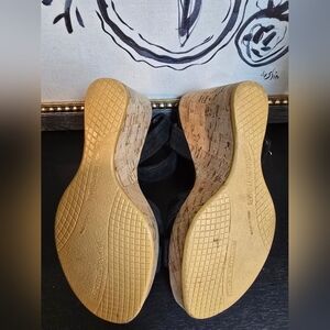 Elegant black wedges with a cork platform. Stylish and comfortable for any outing.