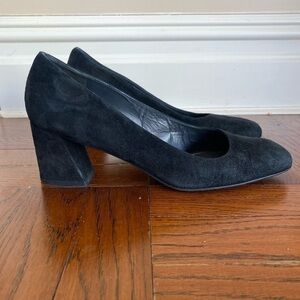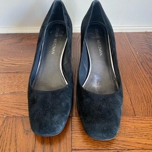 Stuart Weitzman Black Suede Pumps with squarish toe and 2.5” block heel. In very good preowned condition. Size 10 narrow fits more like a 9.