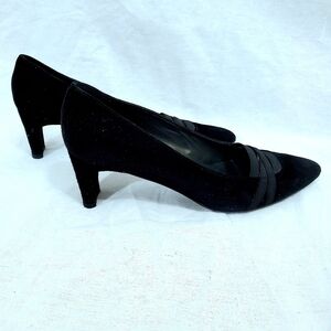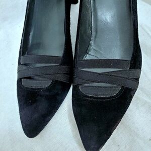 Gorgeous Stuart Weitzman black suede heels. Pointed toe, subtle block heel, approximately 2 1/4" tall. Elastic crossing strappy design on front. Size 7 1/2M. Minor wear, very good pre-owned condition. Box included.