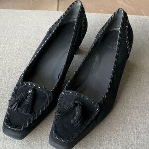 Stuart Weitzman Black Suede Tassel Kitten Heel Loafers