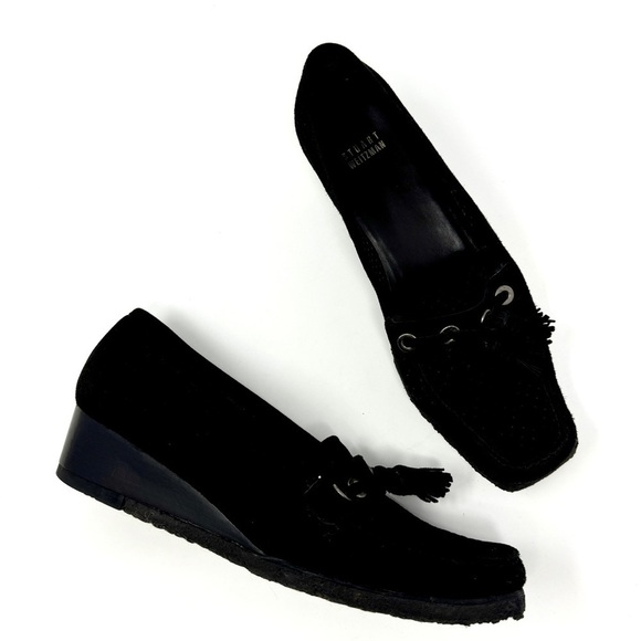 Stuart Weitzman Black Perforated Suede Wedge Loafers