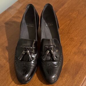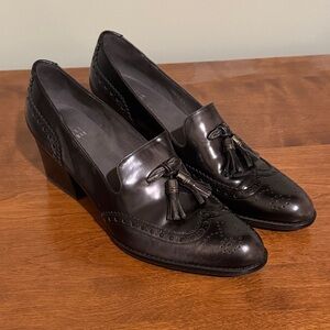 Elegant black loafers with tassel detail and 2inch heel. Perfect for a sophisticated look, wear with trousers, suits, or jeans.