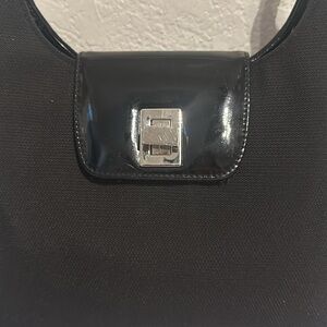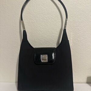Fabric/patent leather exterior, silver tone hardware, feet on bottom, flap with turn lock closure, interior zip and slip pockets. 12" shoulder drop.