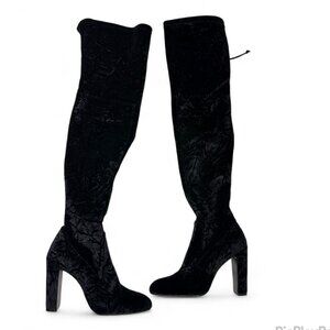 Stuart Weitzman Women's Vidaland 100 black crushed velvet over the knee heeled boot. 7B