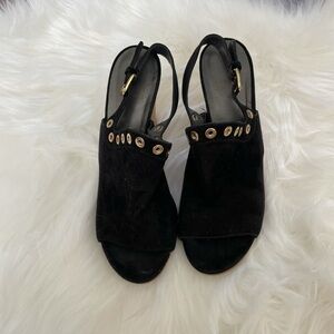 Chic black wedges with a stylish tan cork heel. Features gold-tone eyelet details. Perfect for elevating any outfit.