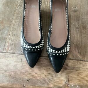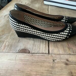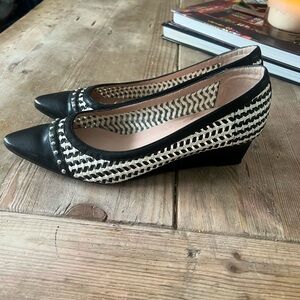 Elegant wedges with a black and cream woven design. Features a sleek pointed toe and subtle stud accents.