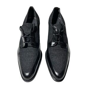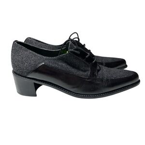 These Stuart Weitzman Oxfords feature a sophisticated blend of black leather and gray textile, offering a sleek and professional look. The shoes are designed with a classic lace-up front and a modest block heel, ensuring both style and comfort for formal or business settings. Stuart Weitzman Woman's Leman Patent Leather Wool Pointed Toe Oxford Flats 8.5B. Great condition! Ships fast. Smoke free home.