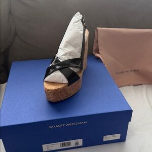 Stylish black straps with a tan cork wedge. Perfect for adding height and flair.